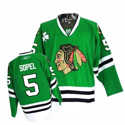 Wear what the players wear with this Brent Sopel Jersey Chicago Blackhawks 5 Authentic Green Man Jersey by Center Ice that replicates the player worn Pro-cut jersey in fabric, trim and team design! The fabric is four-way stretch mesh, which provides a balance of ventilation and range of motion in the underarm and back areas.