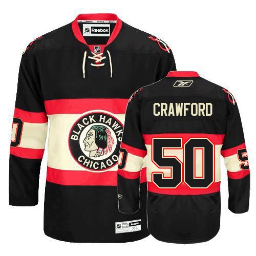 Wear what the players wear with this Corey Crawford Jersey Chicago Blackhawks 50 Black New Third Authentic Jersey by Center Ice that replicates the player worn Pro-cut jersey in fabric, trim and team design! The fabric is four-way stretch mesh, which provides a balance of ventilation and range of motion in the underarm and back areas.