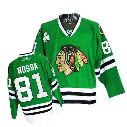 Wear what the players wear with this Marian Hossa Jersey Chicago Blackhawks 81 Authentic Green Man Jersey by Center Ice that replicates the player worn Pro-cut jersey in fabric, trim and team design! The fabric is four-way stretch mesh, which provides a balance of ventilation and range of motion in the underarm and back areas.