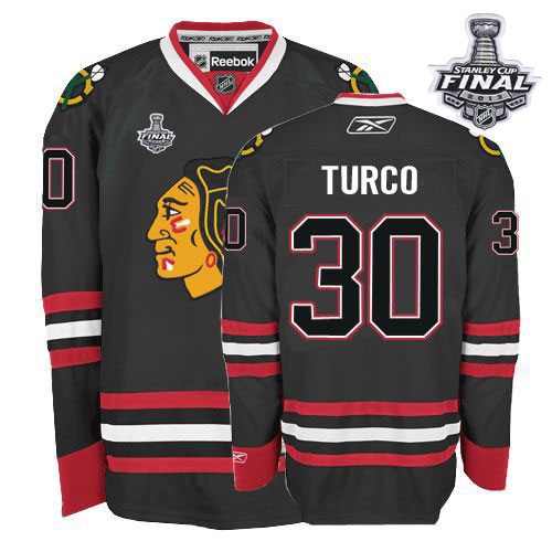 Wear what the players wear with this Marty Turco Jersey Chicago Blackhawks 30 Black Authentic With 2013 Stanley Cup Finals Jersey by Center Ice that replicates the player worn Pro-cut jersey in fabric, trim and team design! The fabric is four-way stretch mesh, which provides a balance of ventilation and range of motion in the underarm and back areas.
