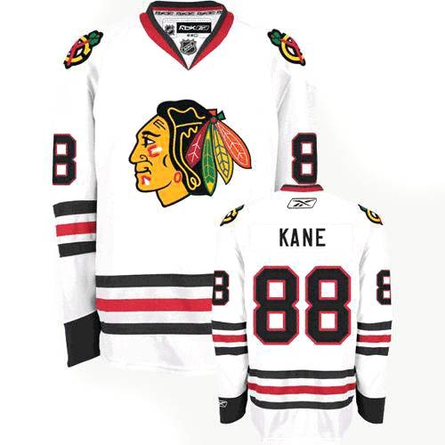 Wear what the players wear with this Patrick Kane Jersey Youth Chicago Blackhawks 88 Authentic White Jersey by Center Ice that replicates the player worn Pro-cut jersey in fabric, trim and team design! The fabric is four-way stretch mesh, which provides a balance of ventilation and range of motion in the underarm and back areas.